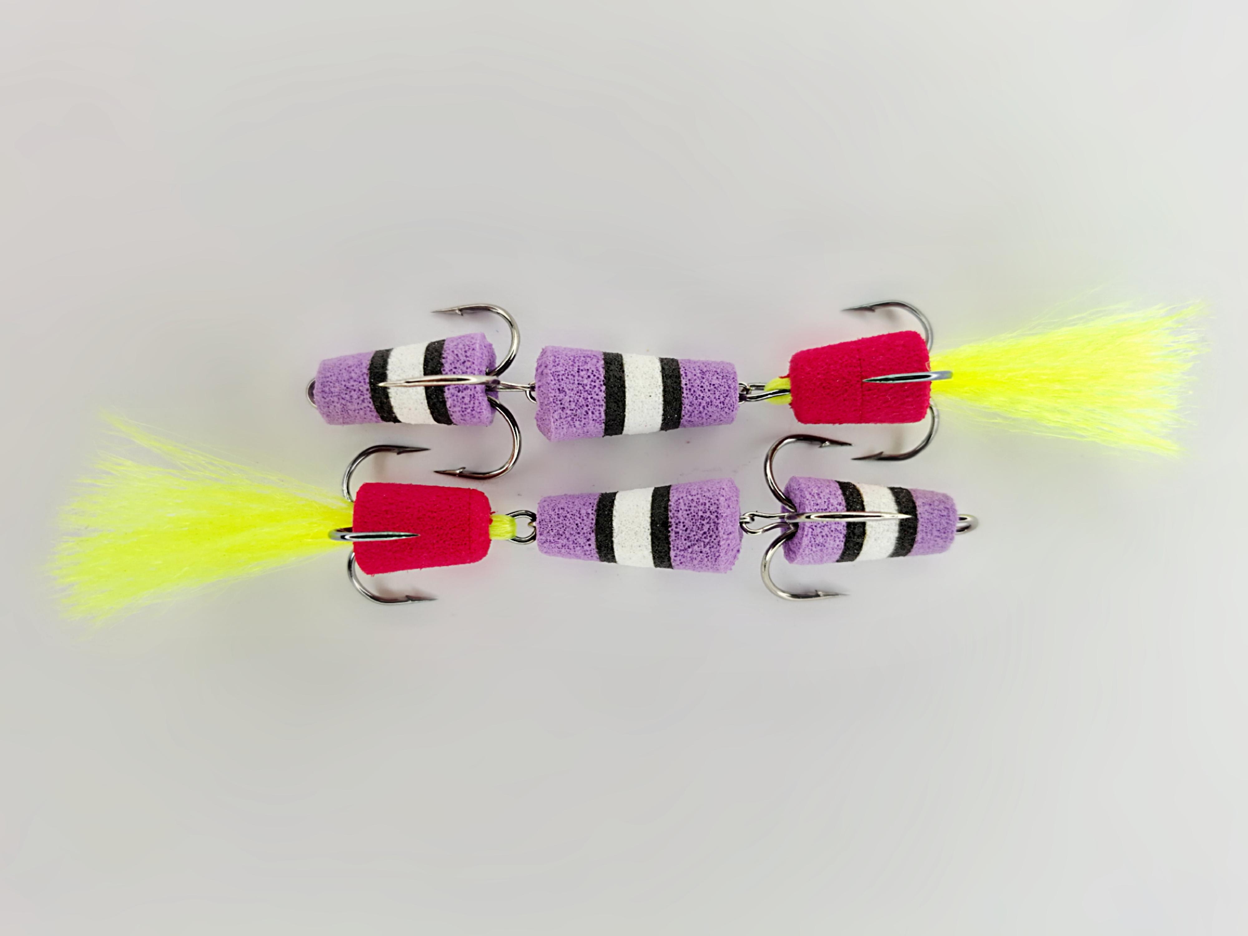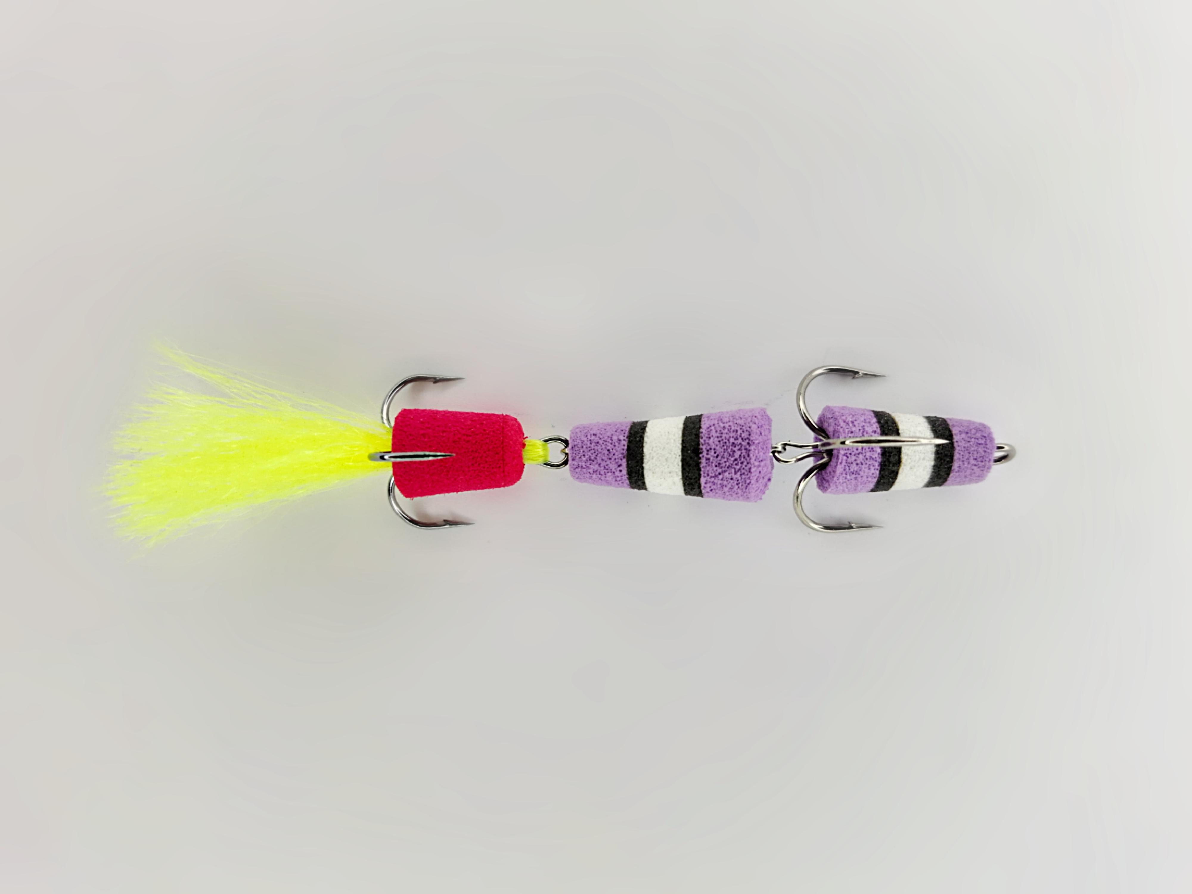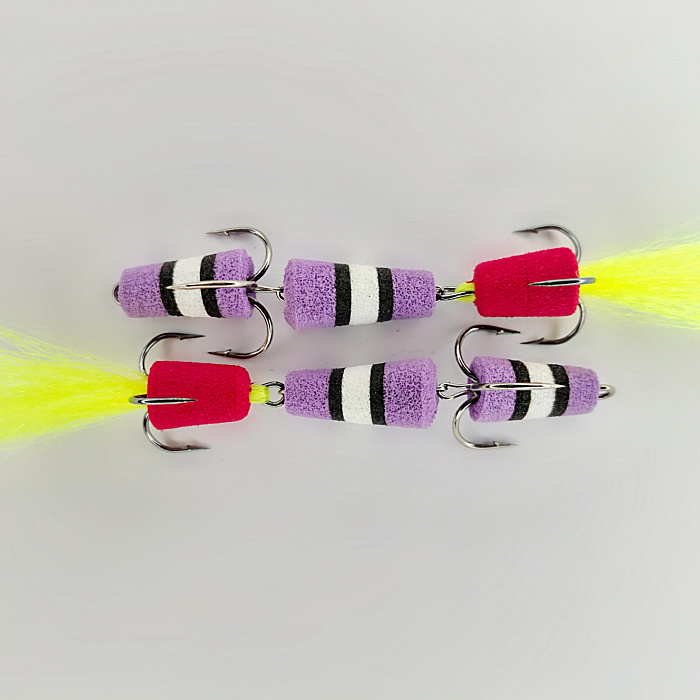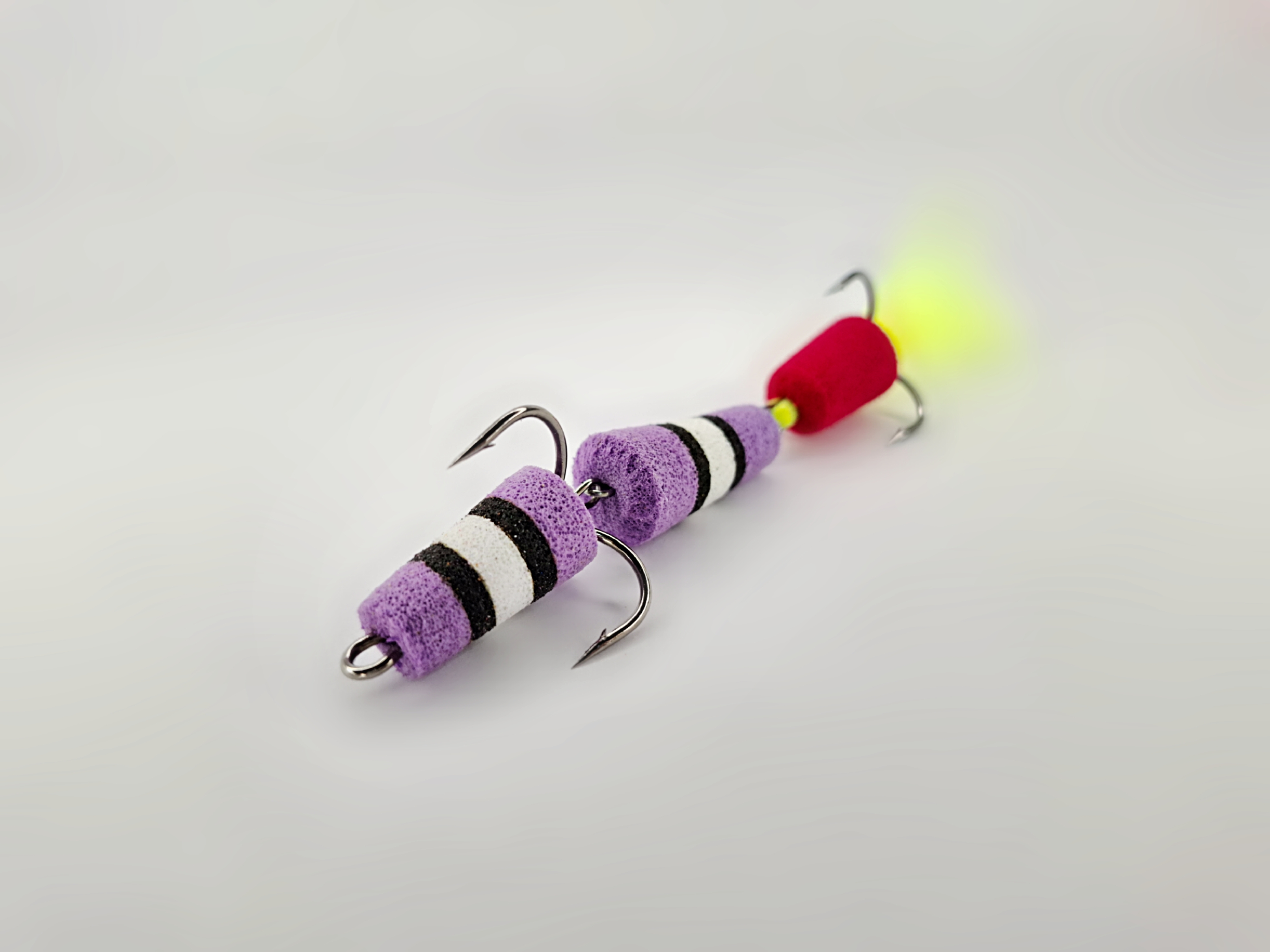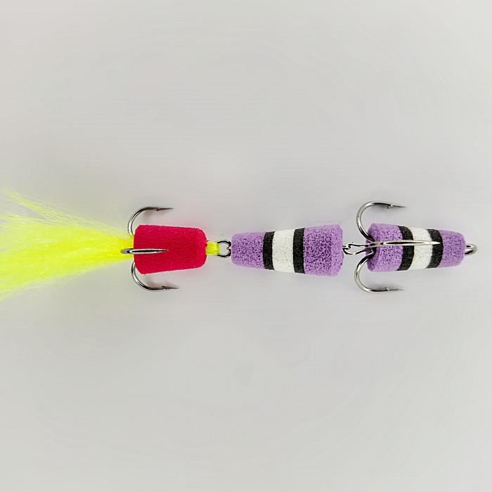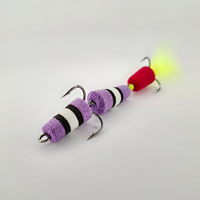 Изготовленная с любовью, она имеет привлекательную окраску: основа выполнена в сиреневом и белом цветах, а также украшена стильными черными полосами. Однако главной особенностью приманки является яркий красный элемент, который привлекает внимание хищников и выступает в роли точки атаки. Этот акцент делает мандулу универсальным инструментом, который эффективно работает в любых условиях.