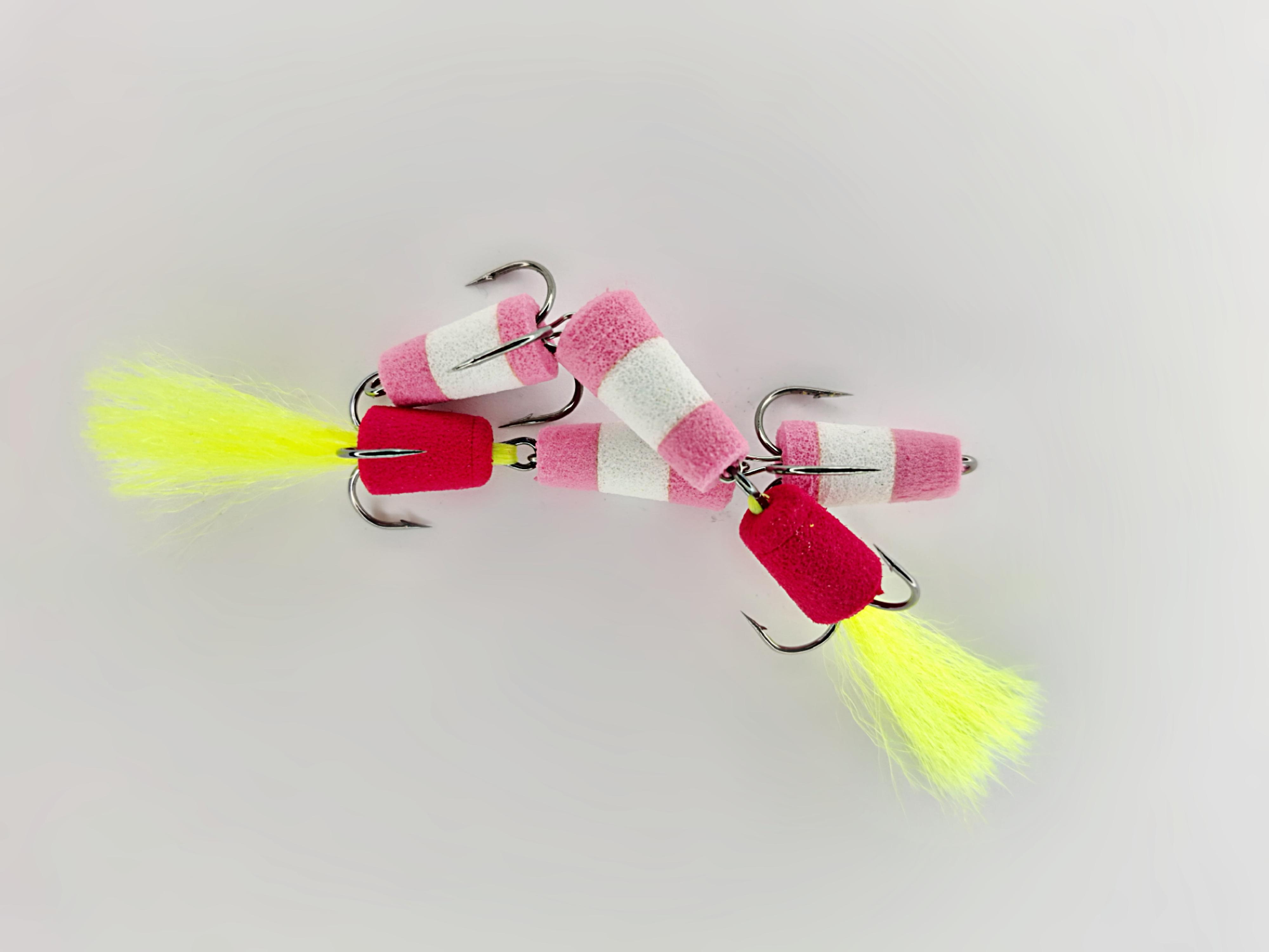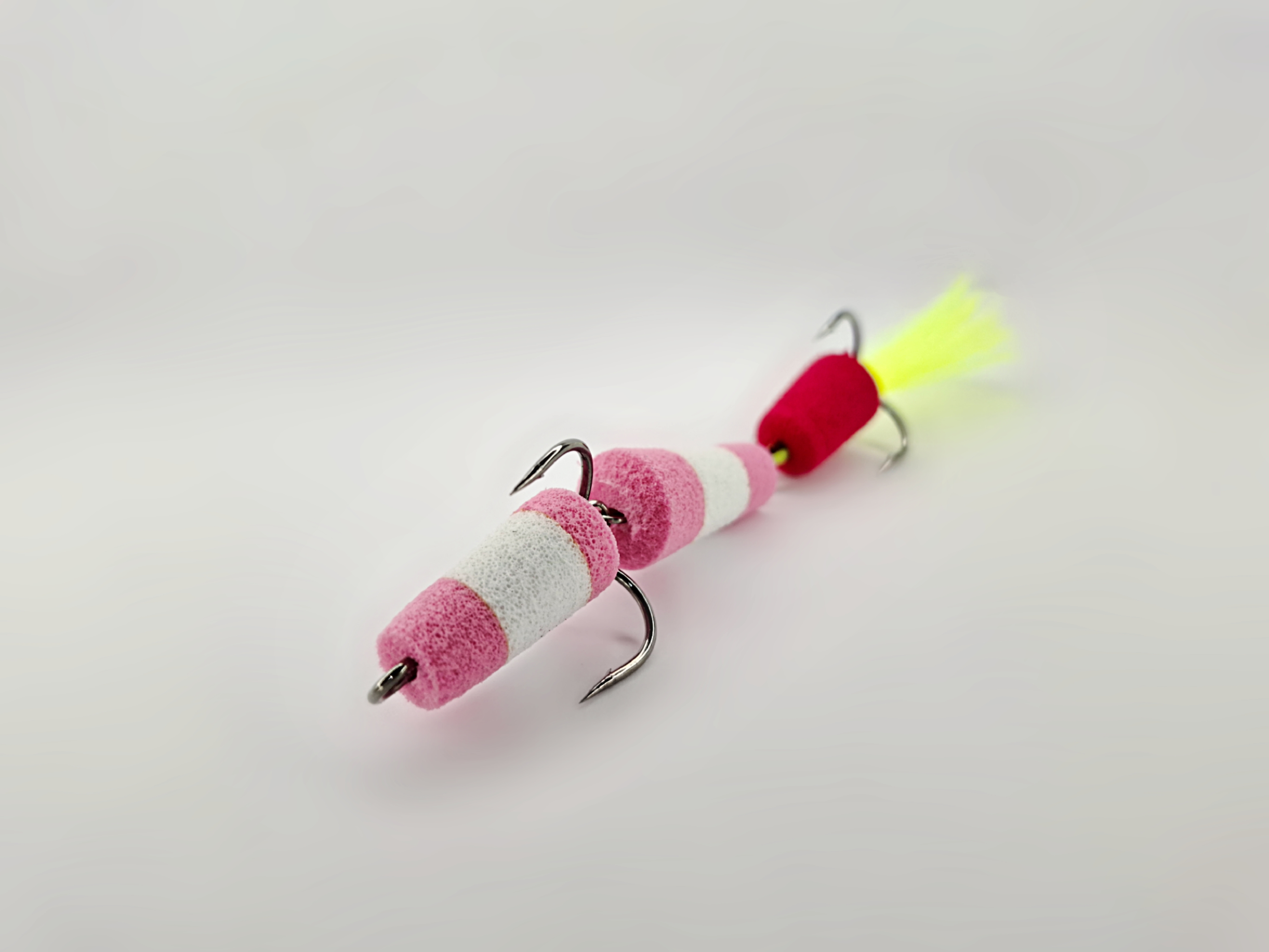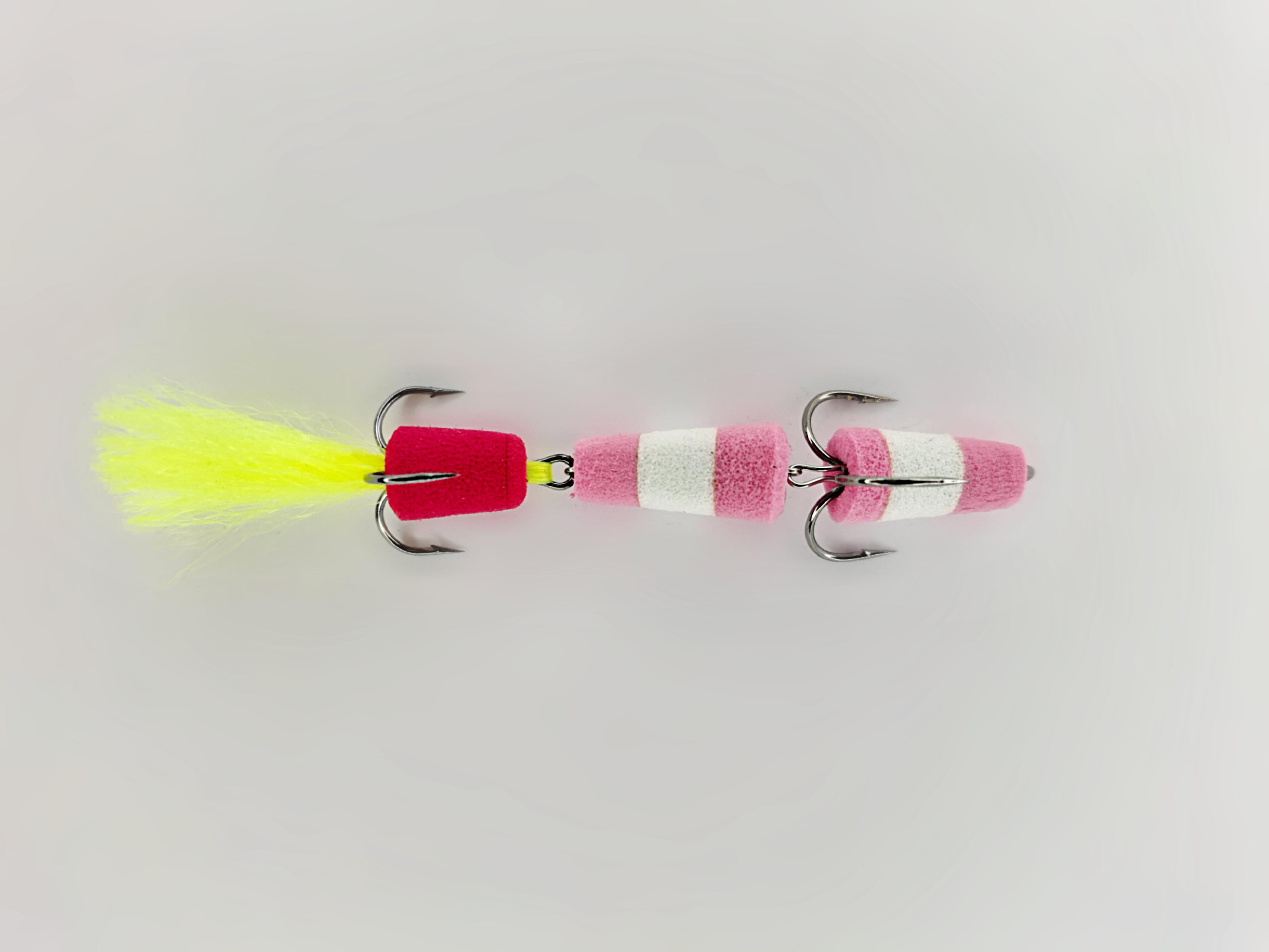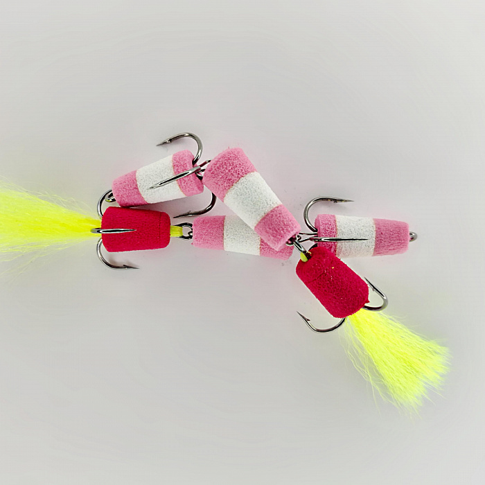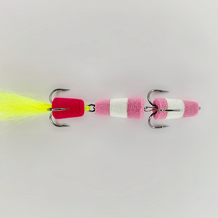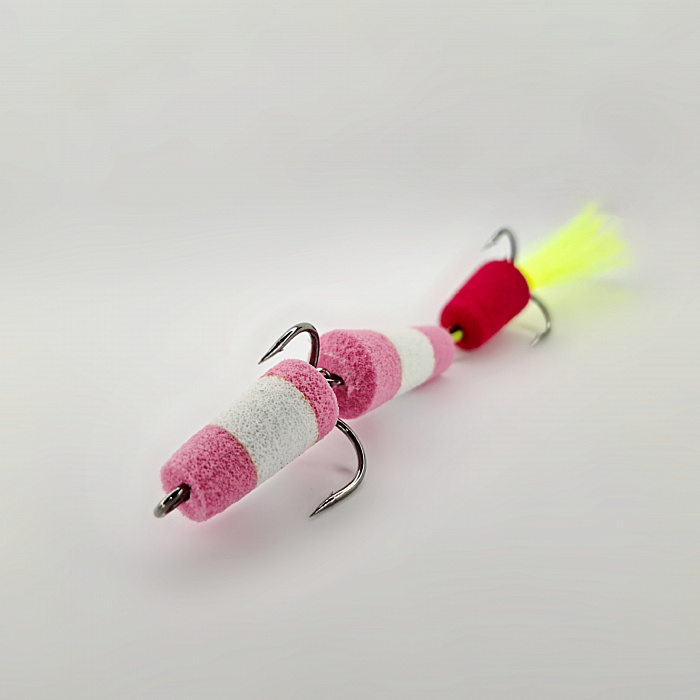 При изготовлении мандулы мы используем сочетание розового и белого цветов, что делает ее заметной даже в мутной воде. Особенностью нашей приманки является дополнительный элемент красного цвета, который привлекает внимание хищников и выступает в роли точки атаки. Его яркость и контраст позволяют эффективно собирать рыбу в радиусе действия приманки.