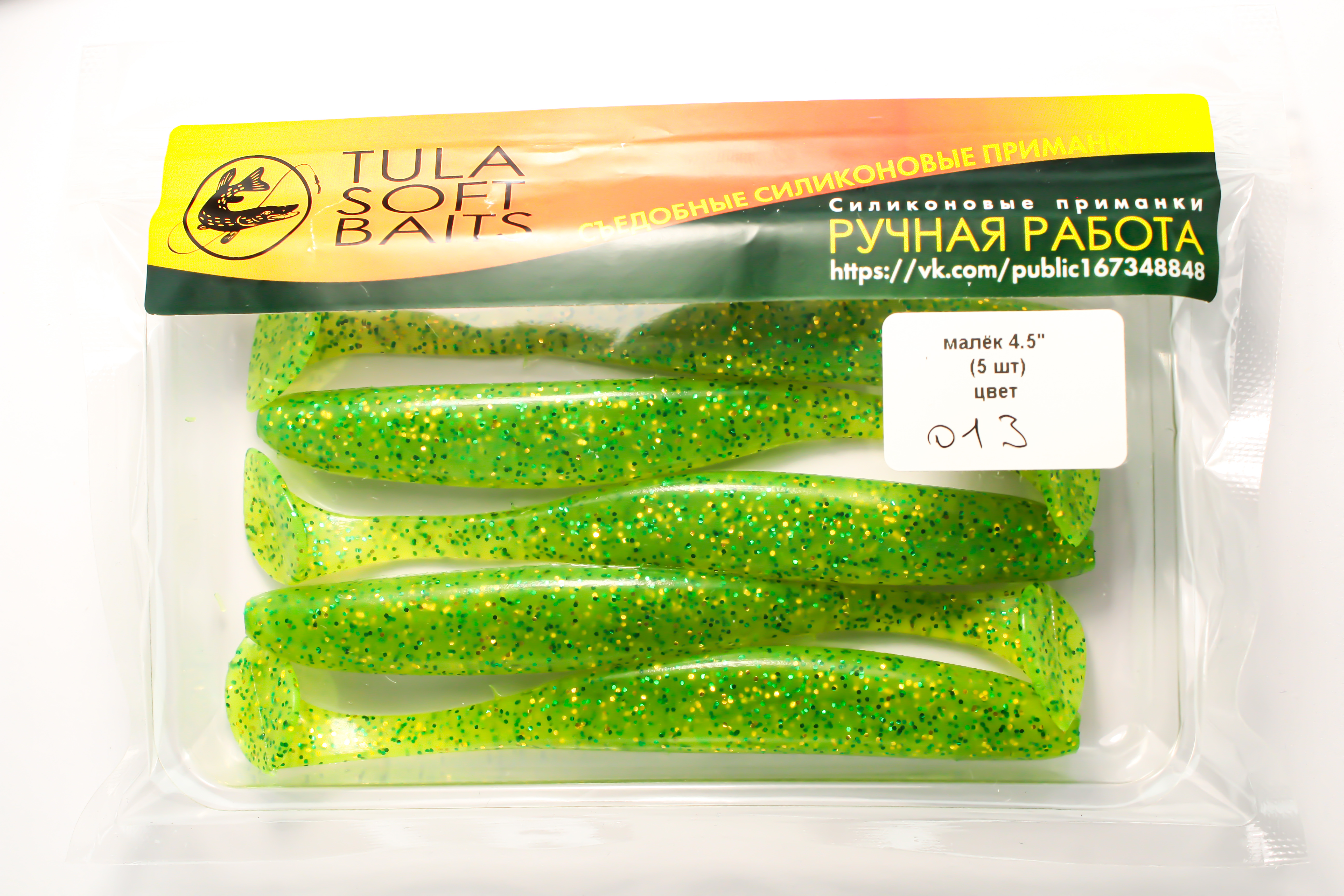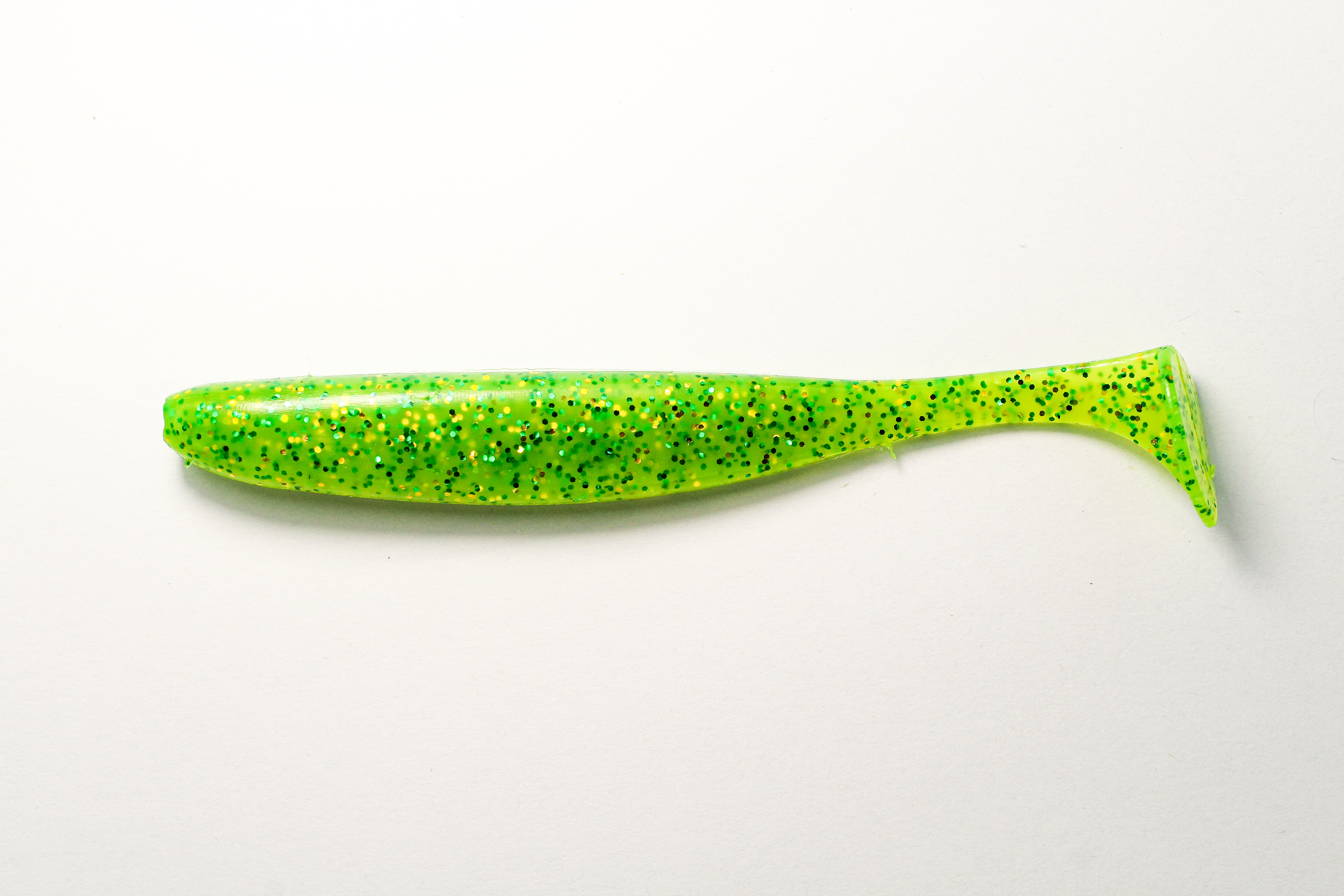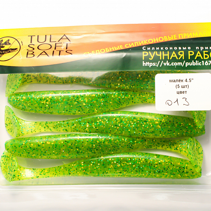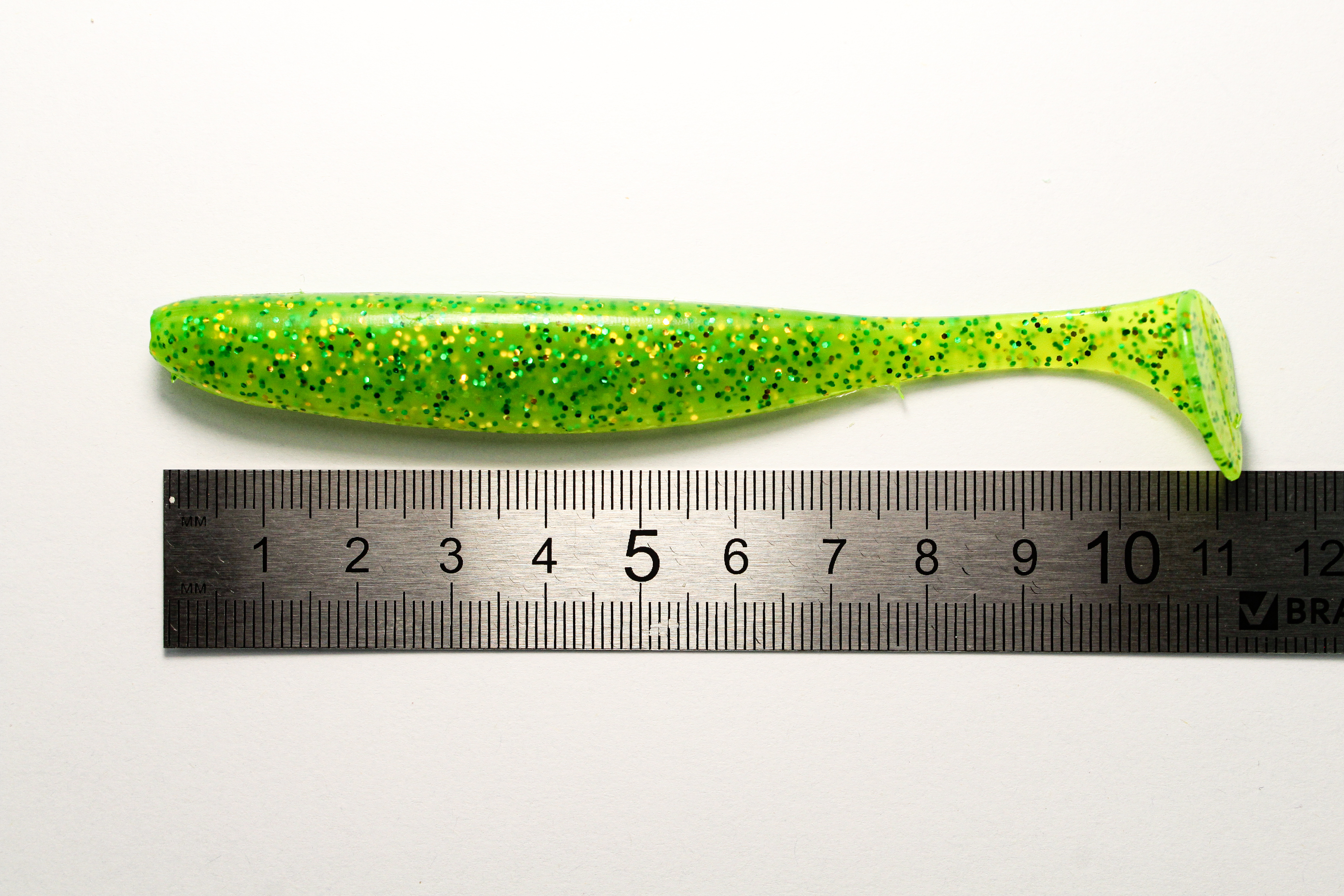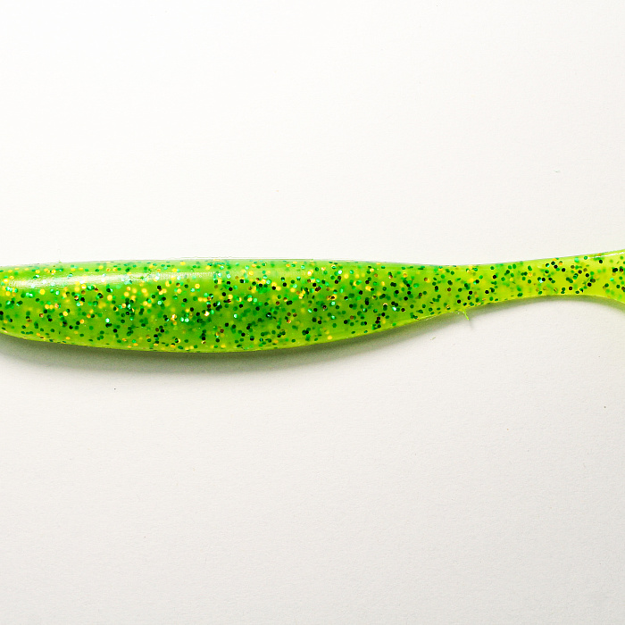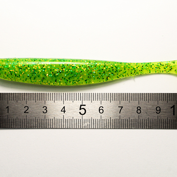 Малёк 4,5" — силиконовая приманка ярко‑зеленого цвета с блестками, созданная для активной ловли щуки и судака.