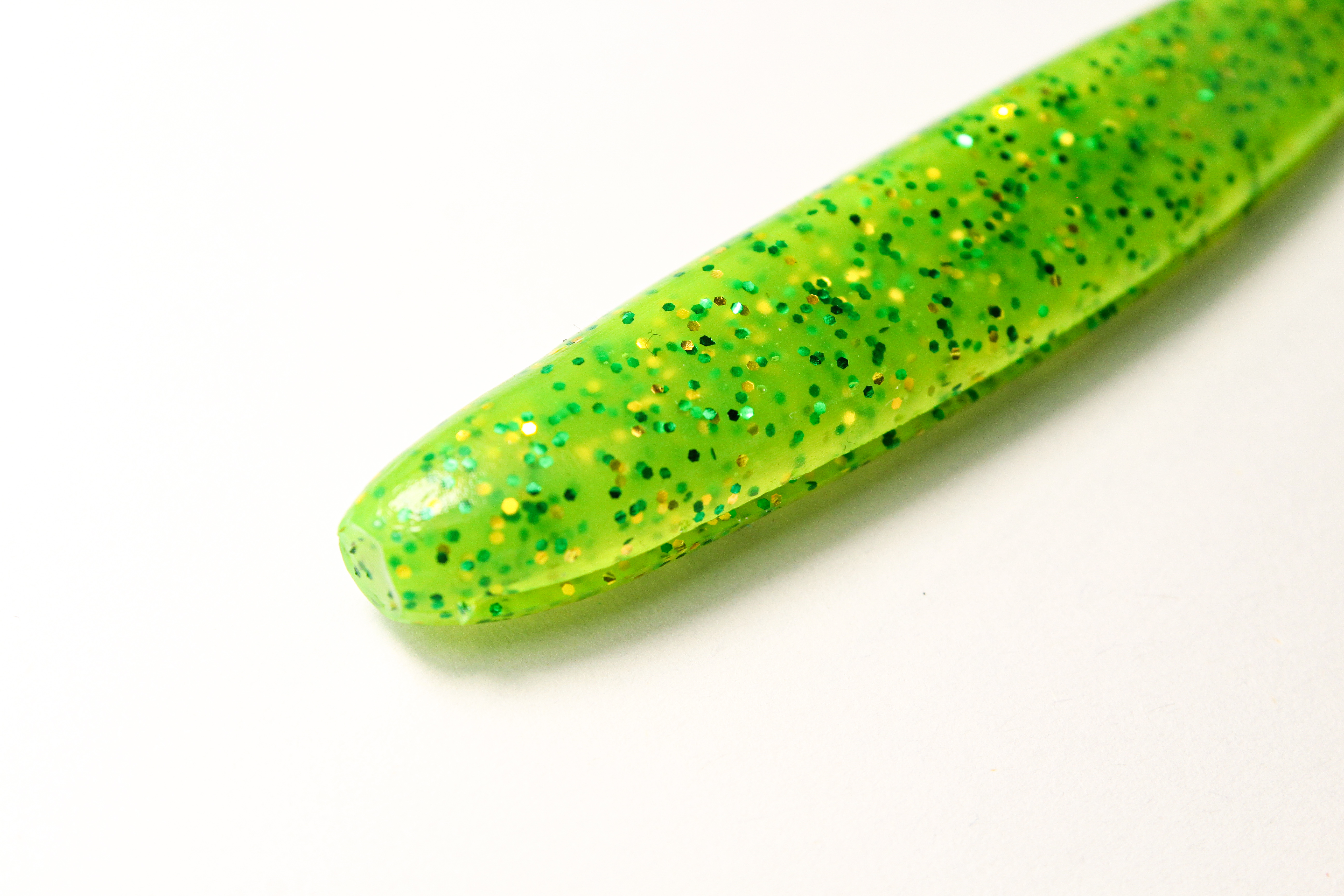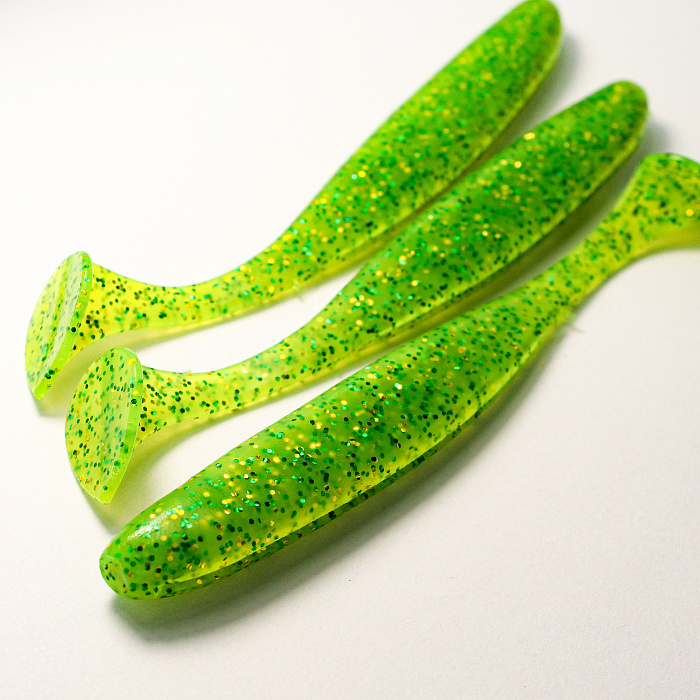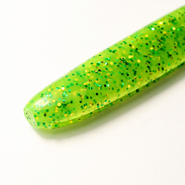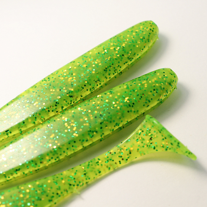 Универсальна для монтажа на джиг‑головки, офсетные крючки и легкие твистер‑оснастки, стабильно работает в разных слоях воды и на неоднородном дне. Ярко‑зеленый цвет с блёстками создаёт заметный контраст в мутной и чистой воде, отражая свет и имитируя чешуйки малька, что повышает дальность обнаружения приманки хищником.
