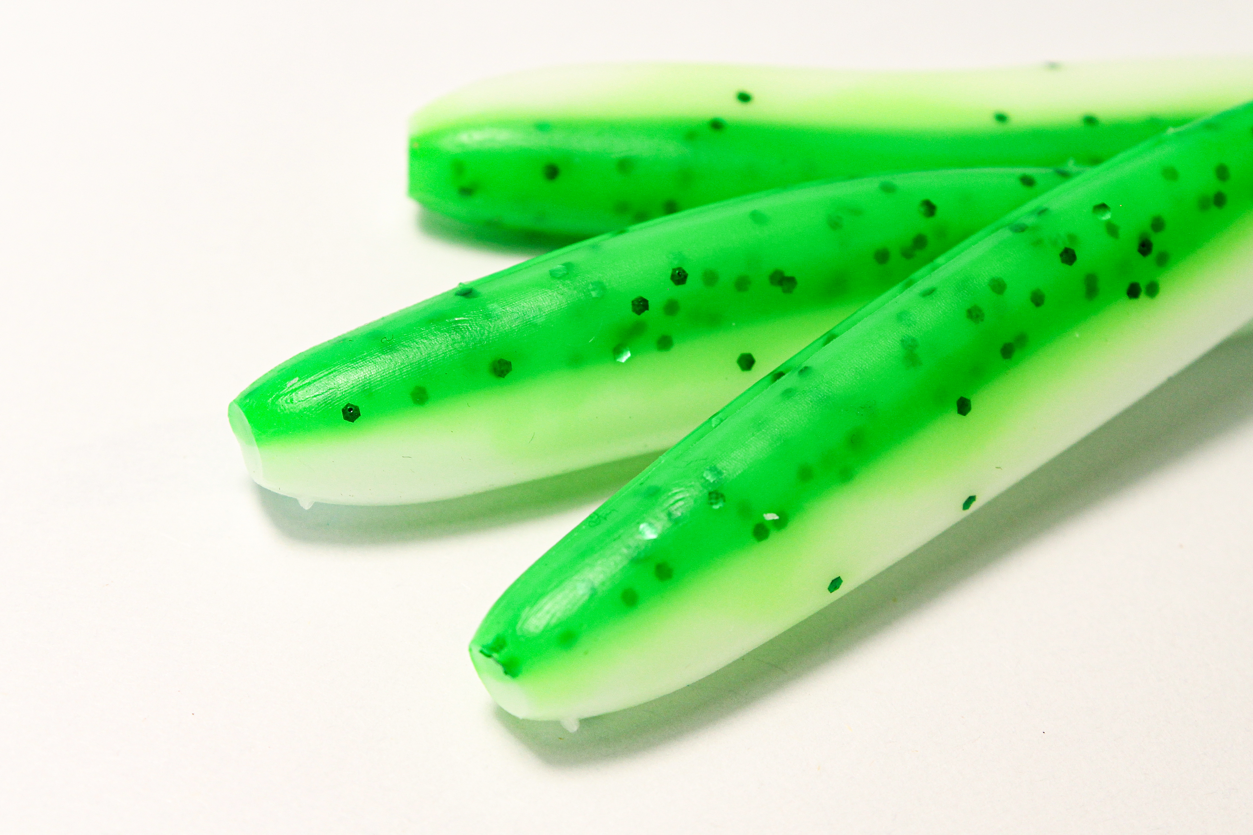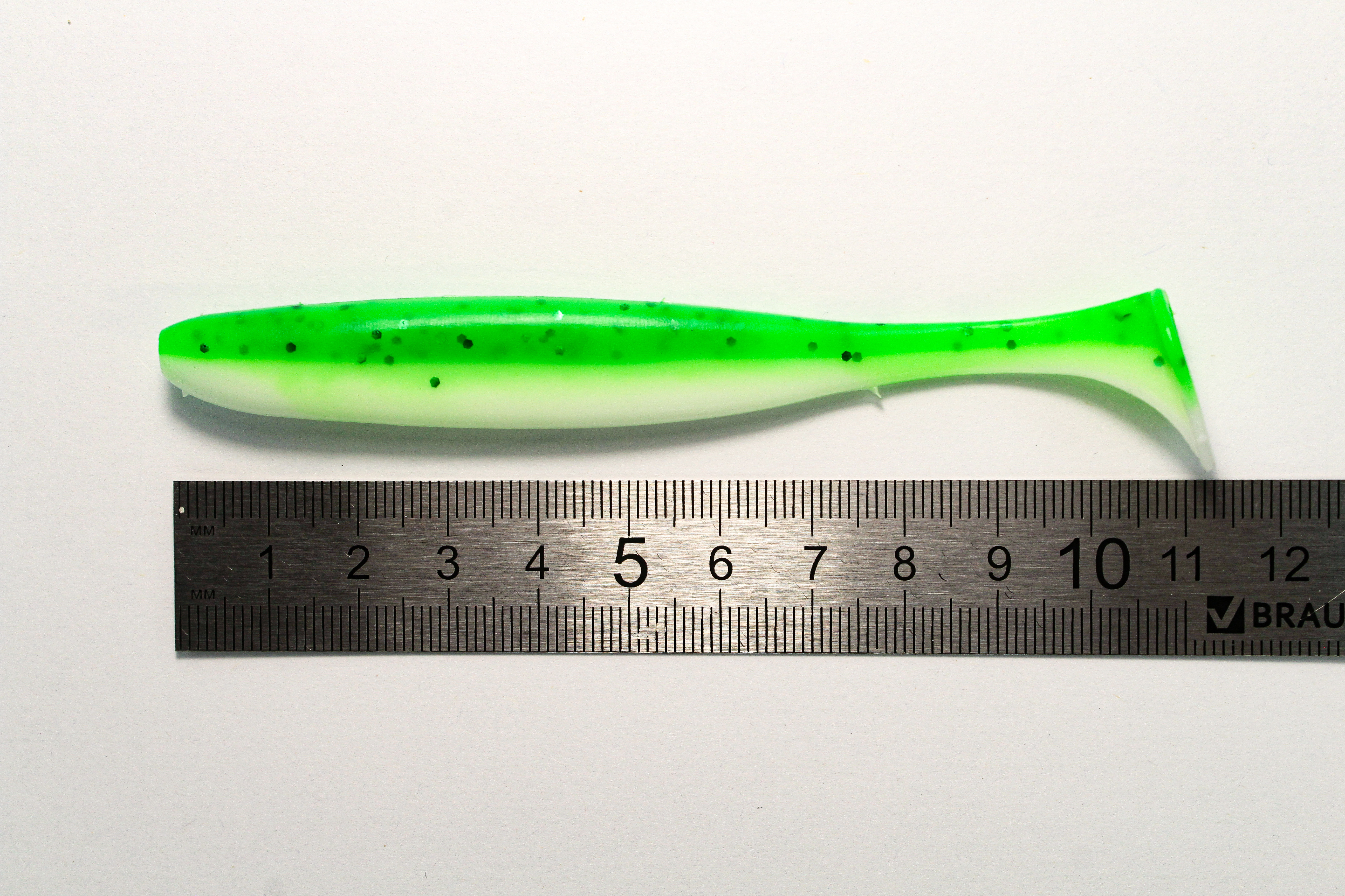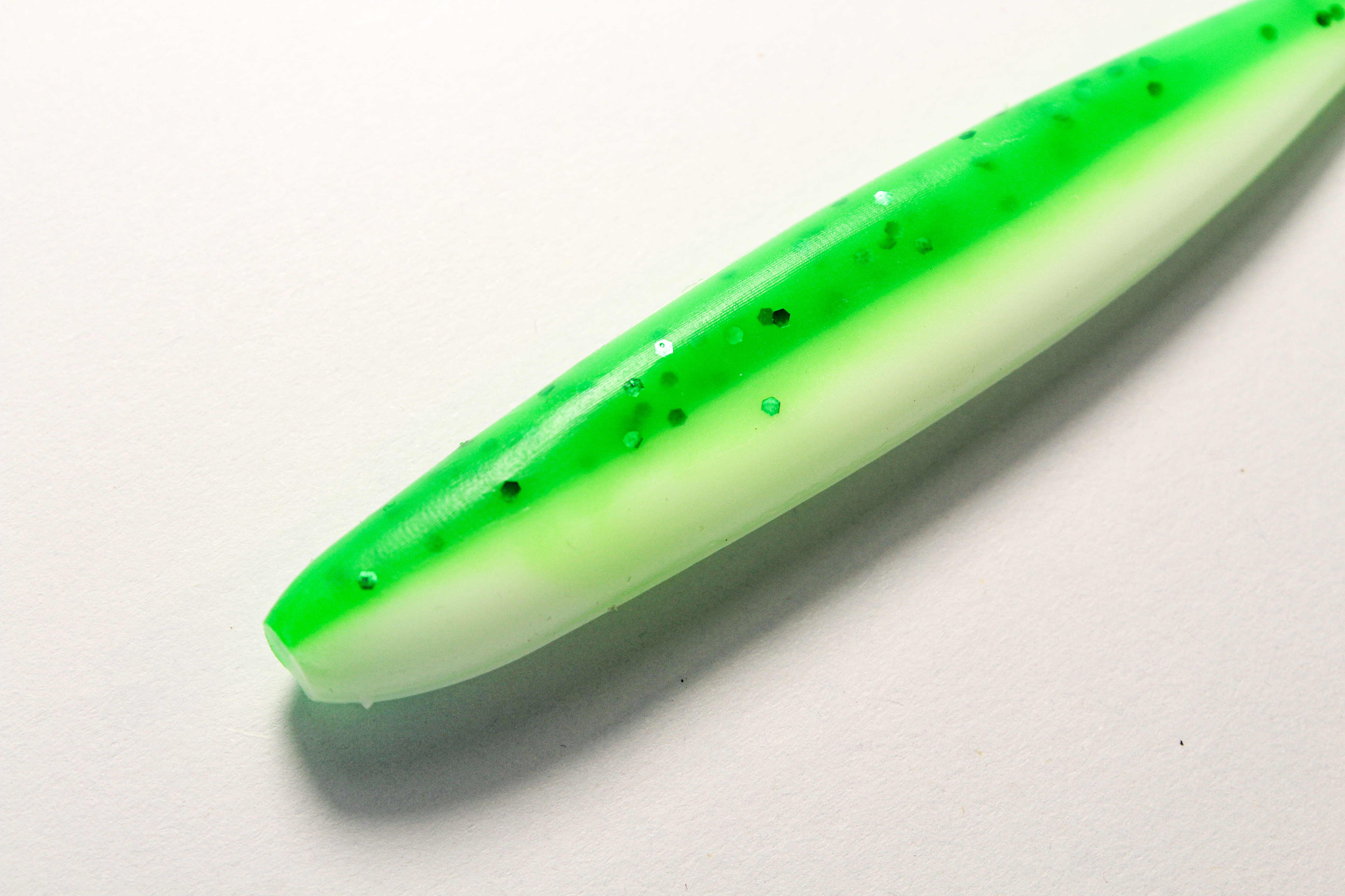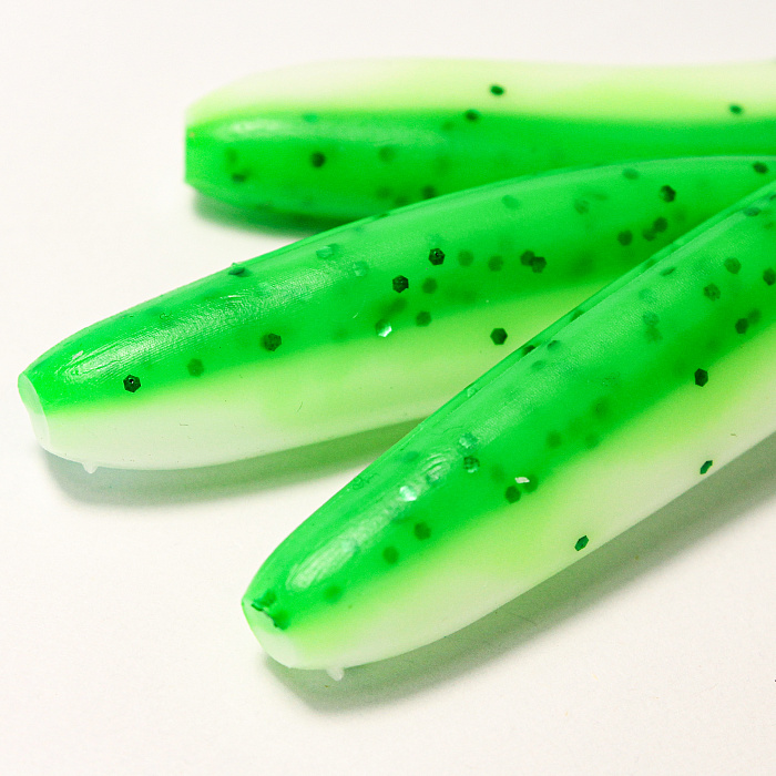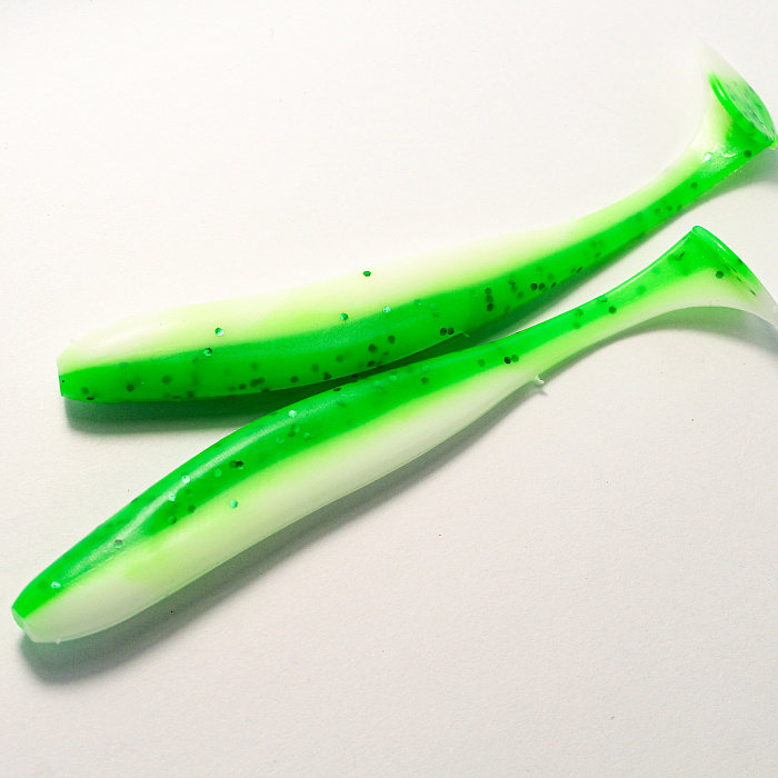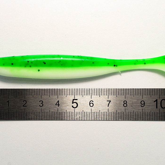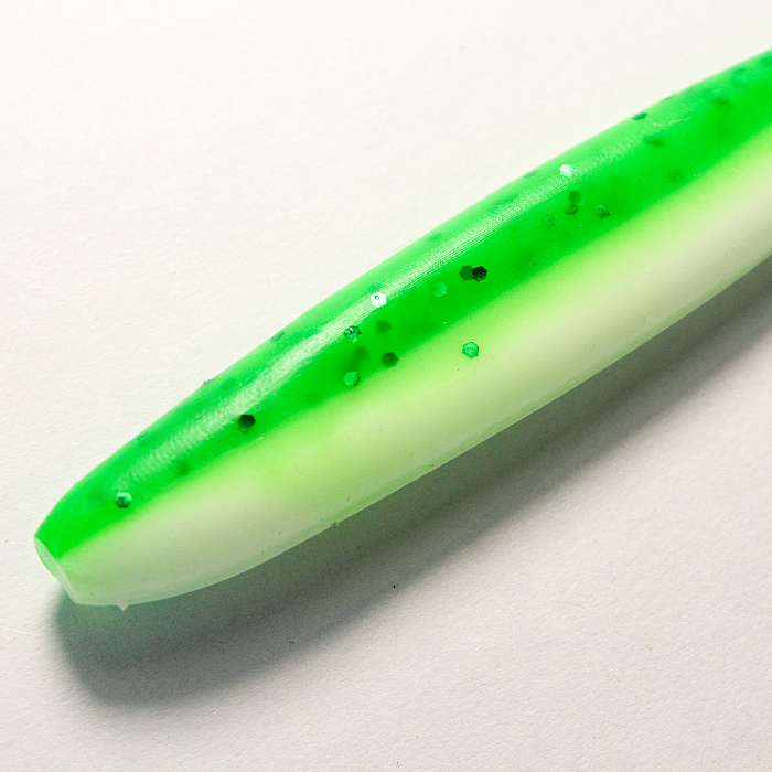 Универсальный профиль позволяет монтировать приманку на джиг‑головки, офсетные крючки и твистер‑оснастки, сохраняя игру при смене условий и типов дна. Контрастная бело‑зелёная окраска обеспечивает заметный силуэт в как в мутной, так и чистой воде, привлекая внимание на дистанции и при слабой освещённости.