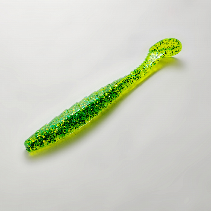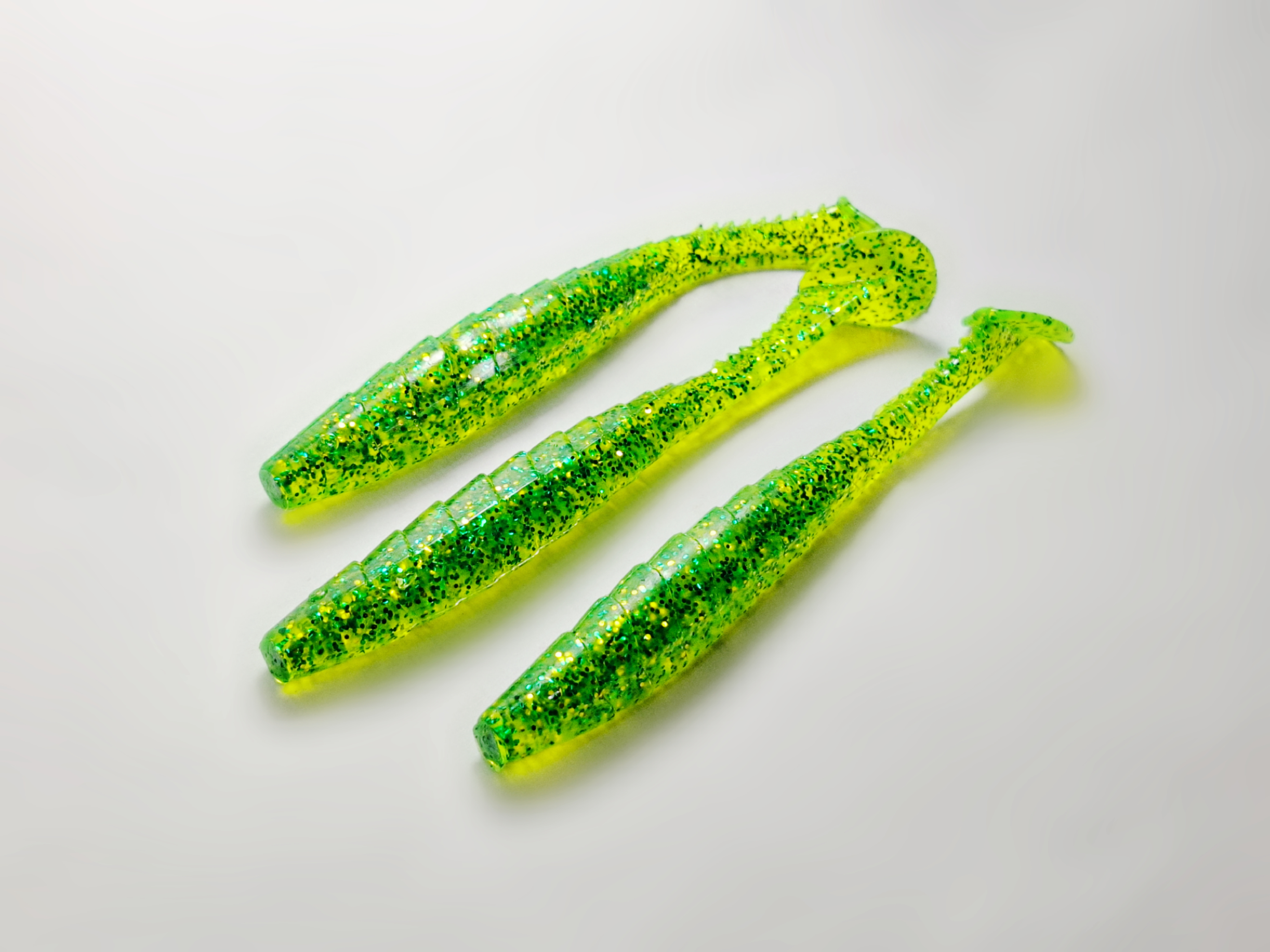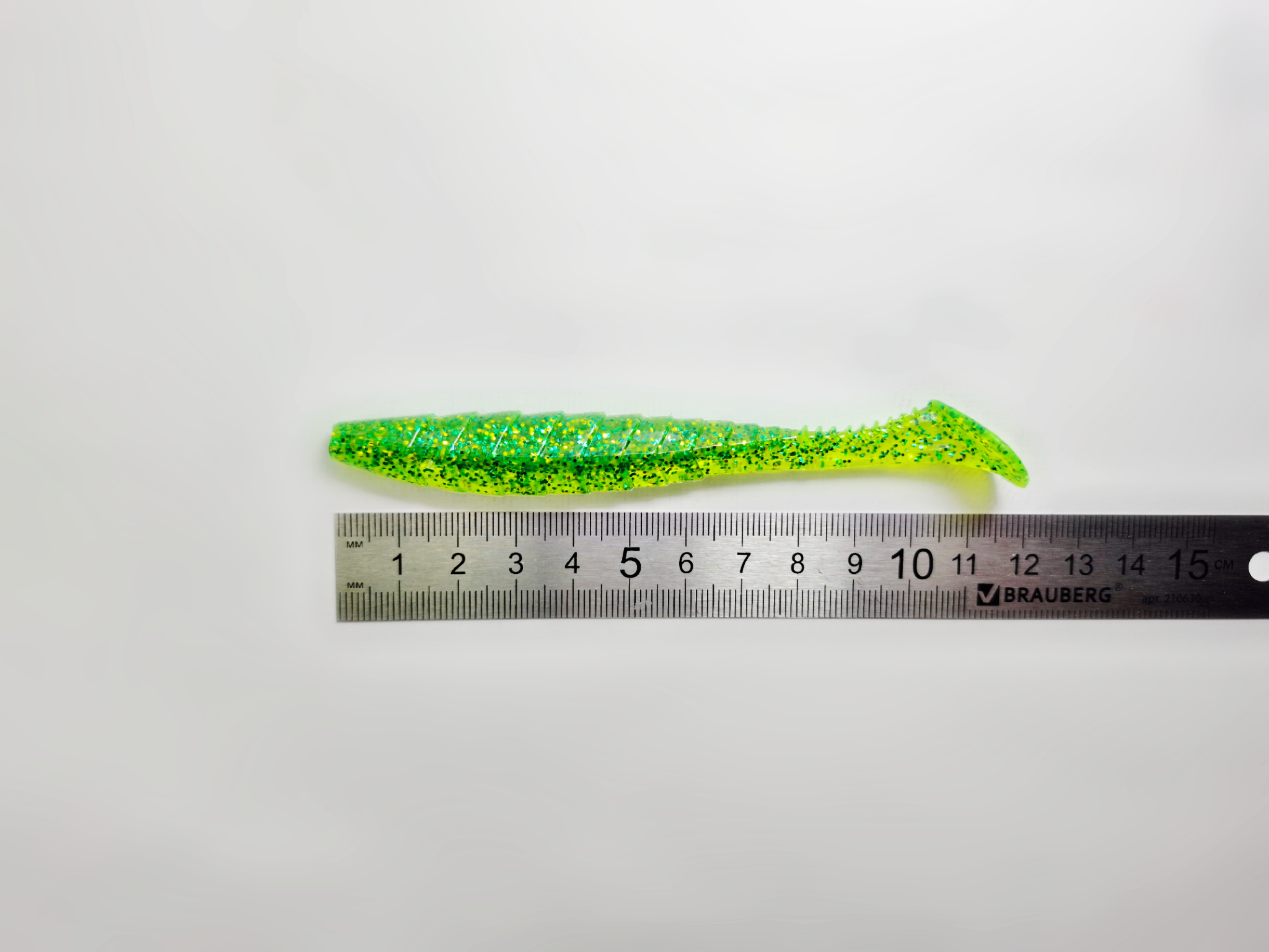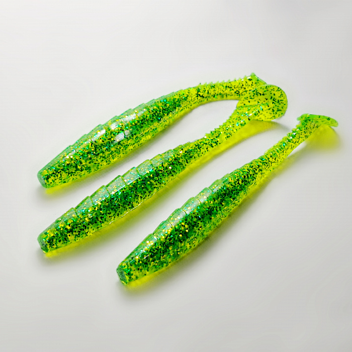 Уникальная форма тела приманки и ребристая структура создают мощные колебания в воде, которые привлекают внимание хищника с большого расстояния. Активная игра хвоста добавляет реалистичности и провоцирует рыбу на атаку. Специально разработанный состав силикона обеспечивает приманке мягкость и эластичность, что положительно сказывается на количестве поклевок.