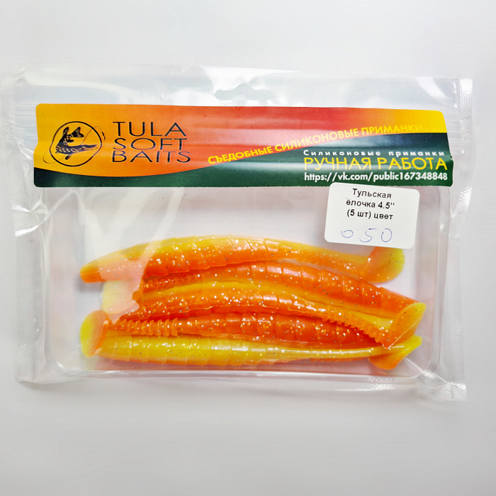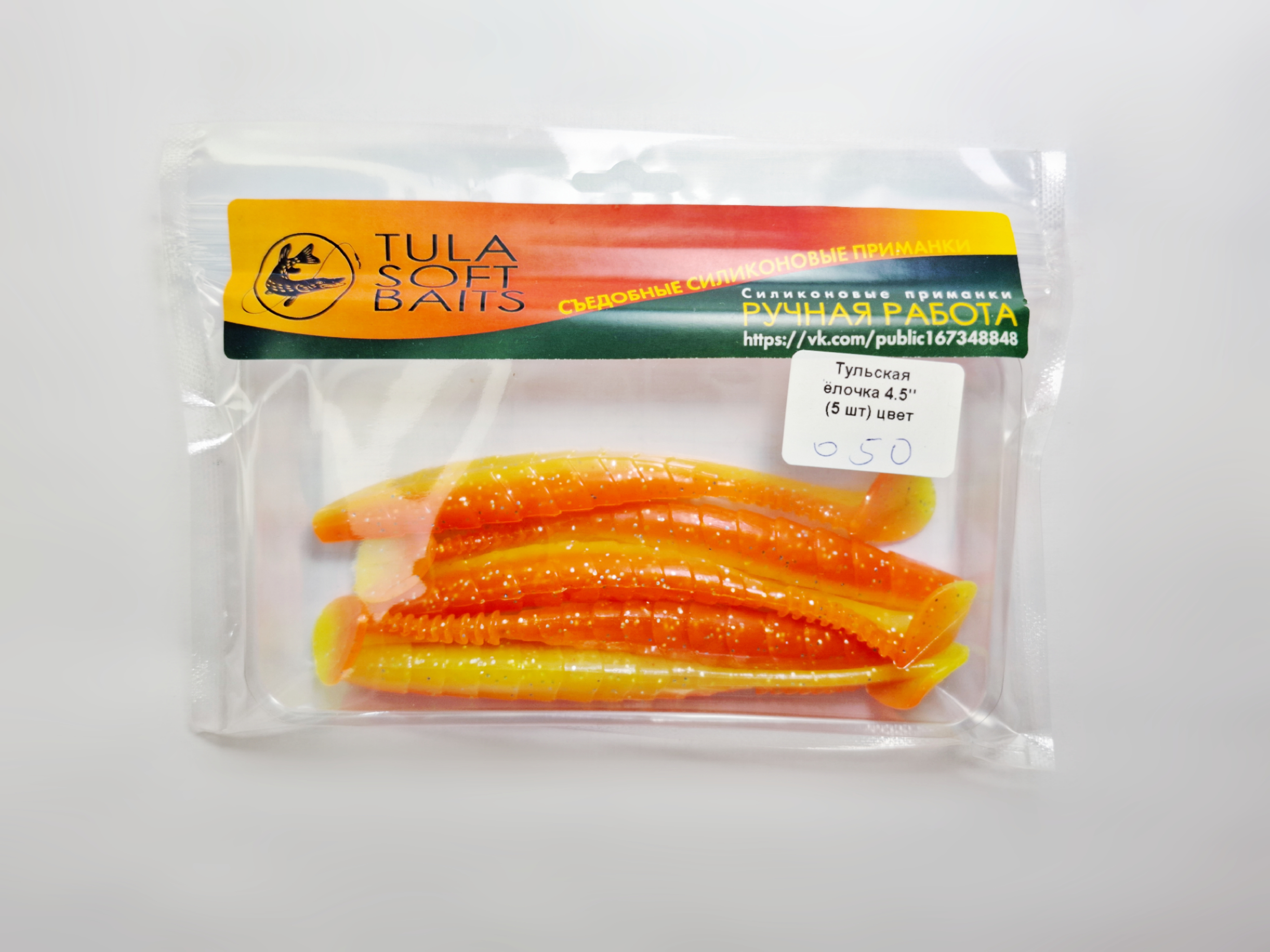 "Тульская ёлочка" изготовлена из мягкого, но прочного силикона, что обеспечивает ей долговечность и устойчивость к повреждениям от зубов хищника. Желто-оранжевый цвет делает ее заметной в различных условиях освещения и прозрачности воды, что особенно важно при ловле в мутной воде или в условиях недостаточной видимости.
