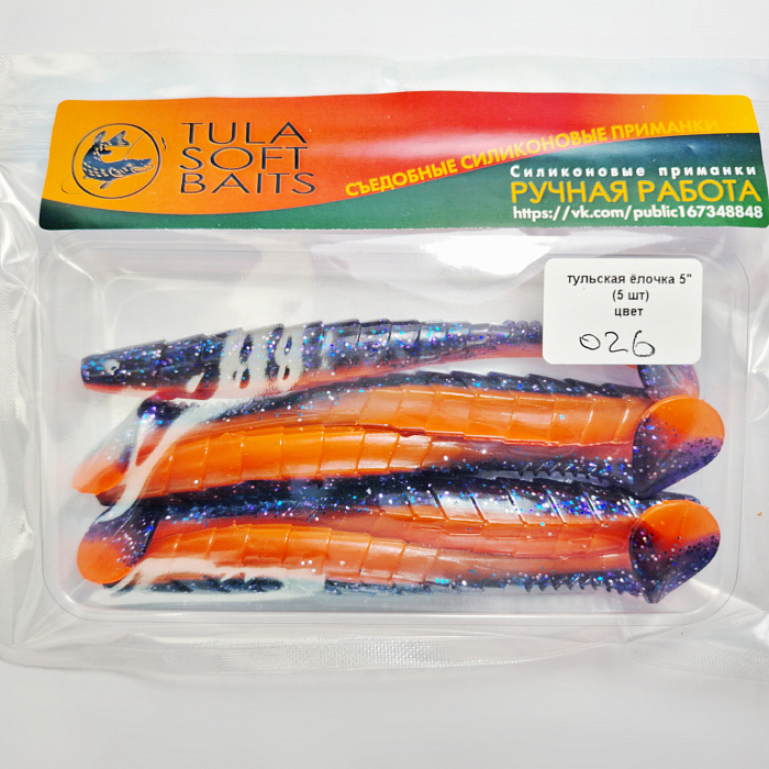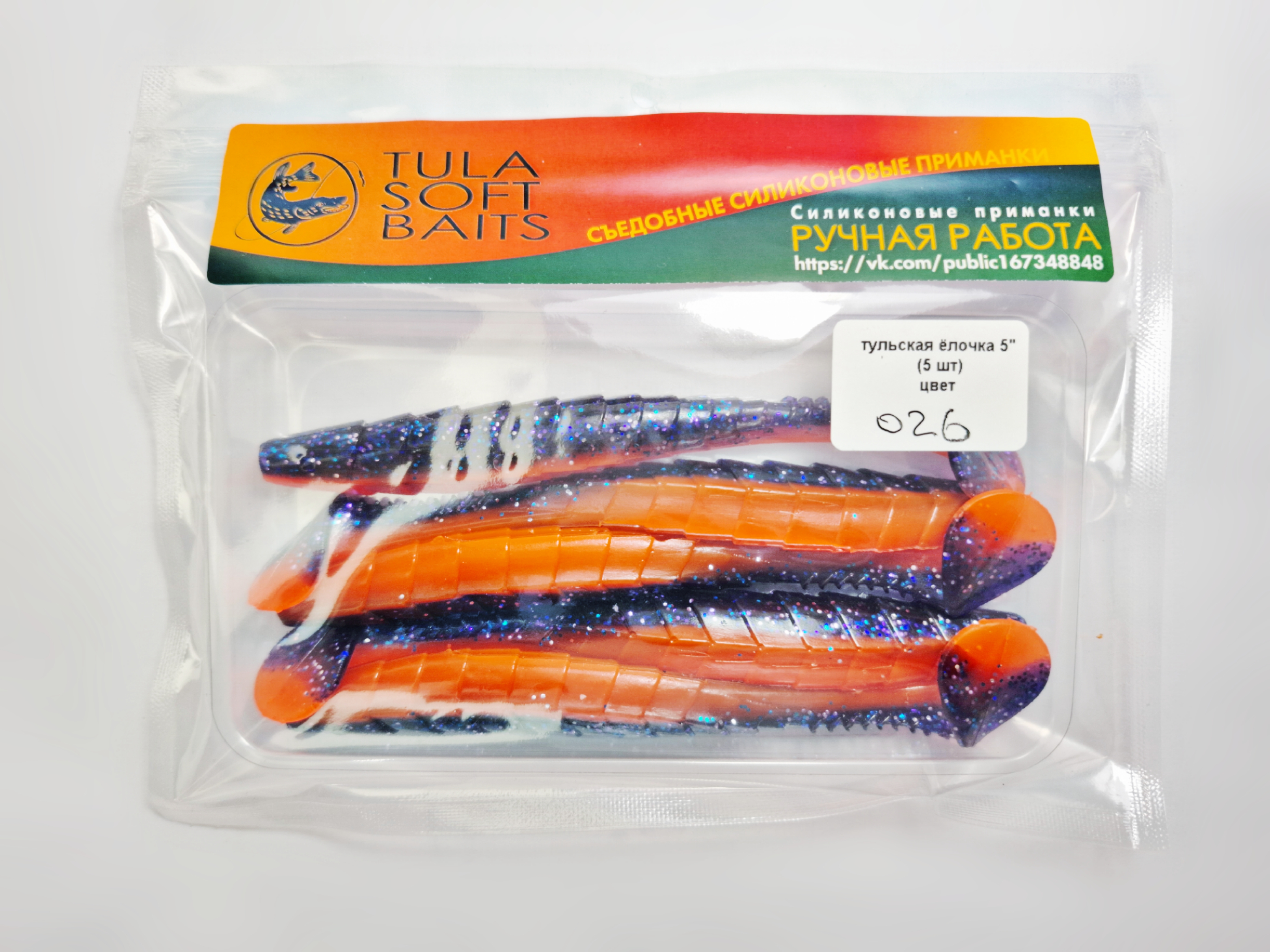 "Тульская ёлочка" – это силиконовая приманка, созданная для успешной ловли хищной рыбы в различных условиях. Ее 5-дюймовый размер и яркая сине-оранжевая расцветка делают ее заметной даже в мутной воде, привлекая внимание как активного, так и пассивного хищника. Уникальная форма тела и подвижный хвост обеспечивают реалистичную игру, имитирующую движения живой добычи.