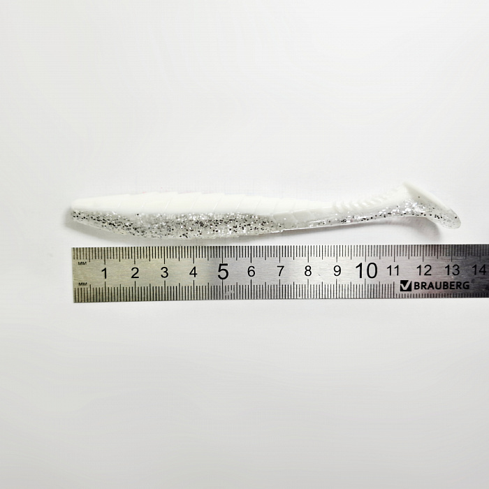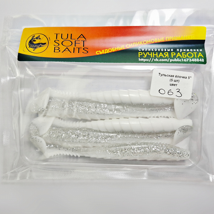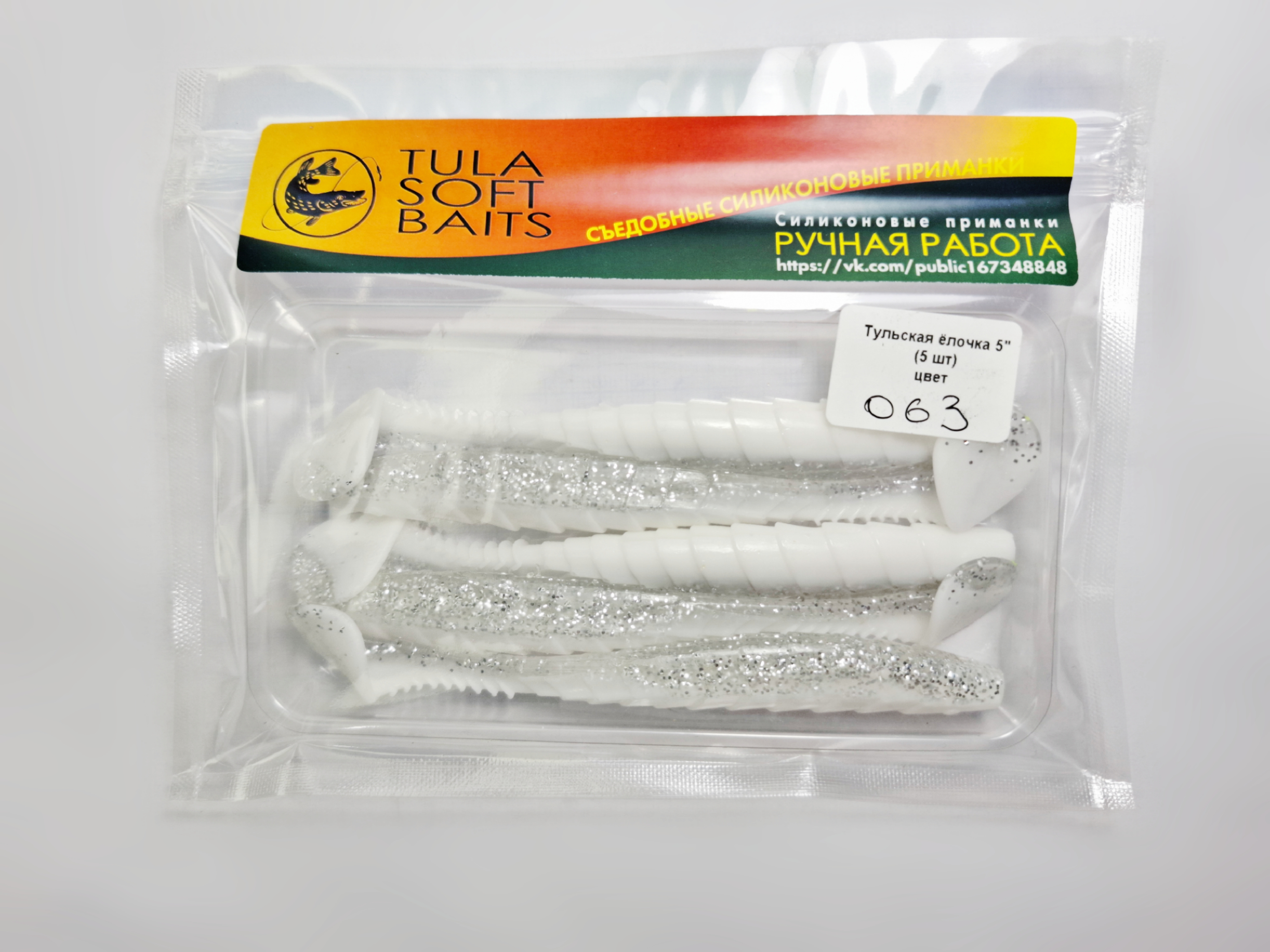 "Тульская ёлочка" 5" – уловистая силиконовая приманка, созданная для успешной охоты на хищника. Белый цвет с мерцающими блестками делает её заметной даже в мутной воде, привлекая внимание щуки и судака с дальних расстояний. Геометрия тела приманки и подвижный хвостик обеспечивают реалистичную игру, провоцируя на атаку даже пассивную рыбу.